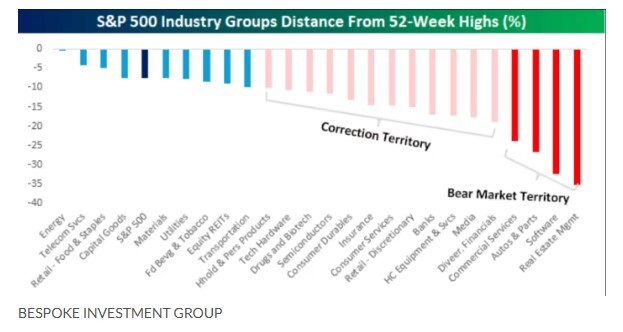 Bespoke Investment Group looked under the hood of the S&P 500 and into the performance of the index’s 25 industry groups. During the past week, 16 of them finished at least 10% below their 52-week intraday highs, according to Bespoke Investment Group. And four of those — real-estate management, software, autos and parts , and commercial services — have tumbled at least 20%, putting them in bear-market territory, Bespoke said in a note emailed to MarketWatch on Friday.